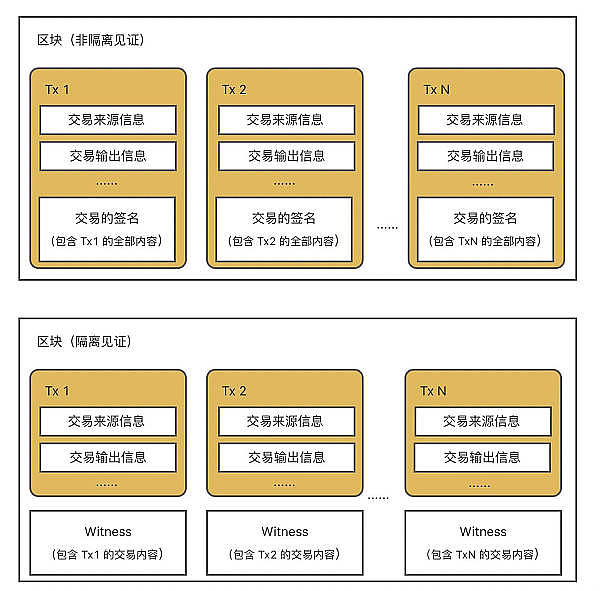 在上面的介绍可以知道目前较新的钱包格式都是采用了隔离见证技术,那么什么是见证(Witness),它是怎么进行隔离的呢。