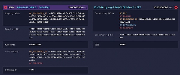 在这个交易中,可以看到签名和输出脚本都是一段计算机指令。「 OP_PUSHBYTES 」表示向栈中 PUSH 一段数据,首先在 ScriptSig 中 04ae 用自己的私钥对整个交易进行签名,该签名的会被压入栈。之后再往栈中压入公钥,最后在「 OP_CHECKSIG 」中,用公钥对签名解密,比较交易是否一致。如果一致则表明身份有效。