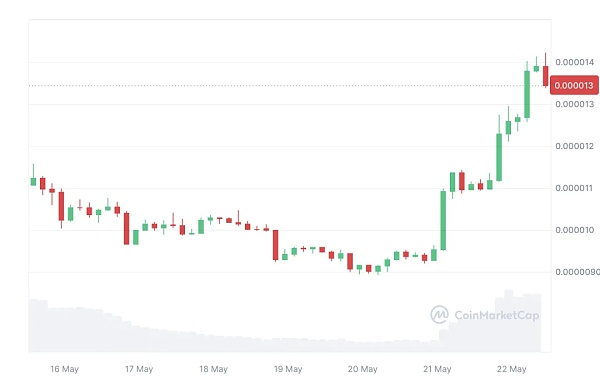 根据 CoinMarketCap 数据,PEPE 的交易价格为 0.00001387 美元,在过去 24 小时内上涨了 23.48%。