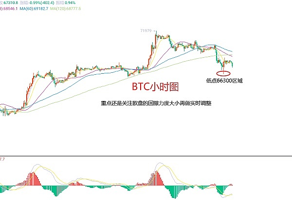 5月24日比特币(BTC)合约技术面分析:今日方面,大周期日线级别昨日报收小阴线,K线形态连阴下跌,附图指标多头缩量,但价格还是在高位,所以目前短时间的趋势走势大概率是震荡为主,我们需要注意的是当天的高低点的破位情况,根据实时行情走势做实时调整,这就是当前的整体思路;短周期小时图昨日欧盘下跌美盘延续向下破位前一日低点位置,凌晨以及今日早间横盘整理,当前K线形态连阴,价格承压下跌,快慢线在零轴下方,那么日内大概率还是有回撤的,因此今日BTC短线合约交易策略:现价67400区域直接空,止损67800区域,目标看66600-66300区域;