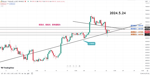 虽然比特币昨天大幅下跌,但67300的前高点目前仍然需要守住。4小时级别的第阻力在68130,第二阻力68640。