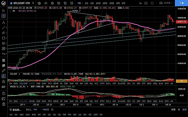 大饼昨日白盘波动不大,整体呈碎步上行走势,最高触及70085附近受阻,随后行情迅速下跌,最低跌至66300附近支撑,目前币价在67980附近运行,四小时级别行情呈震荡下跌走势,短期止跌插针反弹,k线由阴转阳,macd空头缩量双线死叉向下,目前走势回踩力度不大更多的是偏向反弹,短线压力在68300附近,日线级别关注能否收线在67500上方,守不住的话会先回踩至66000-65000区间,给到机会可以逢低买入,还是处于牛市中,突破新高只是时间问题,上方压制68300-69000,下方支撑67400-66500