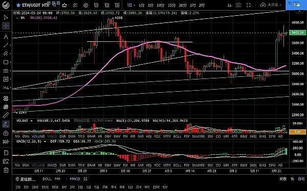 以太坊昨日走势依然很强,晚间一波拉伸突破前高,最高触及3950一线形成顶背离结构走出回踩,最低插针至3532附近,恭喜跟上思路的朋友多单获利两百点,目前币价在3800附近运行,四小时级别下方支撑较强,行情插针后迅速反弹价格重新回到3800上方,macd空头无量运行双线死叉向下,短期走势多空博弈震荡调整的概率较大,日线级别etf通过后并没有出现直线上涨,反而来回洗盘,个人认为上涨行情还没有结束,洗掉筹码为了后市更好拉升,先关注4088前高附近一旦站稳很大概率会冲击新高,短期不要怕回踩,给到机会分批买入即可,上方压制3830-3950,下方支撑3700-3650
