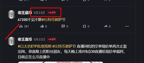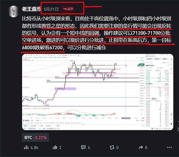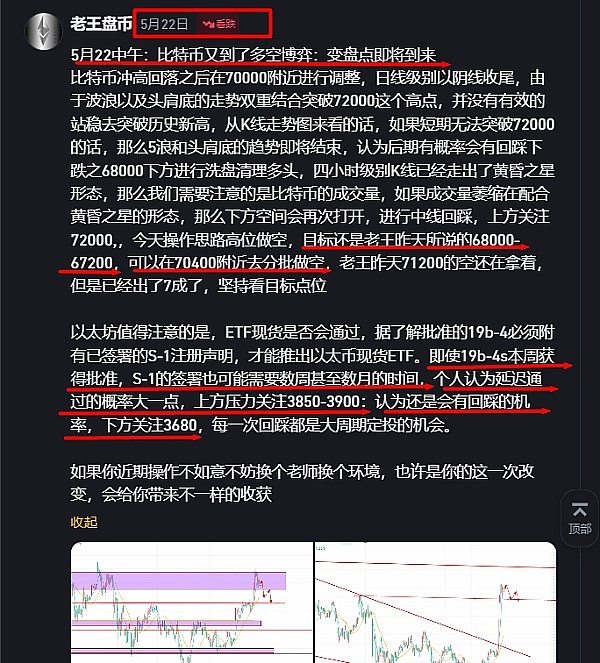 大家好,我是老王,还记得老王连续三天提醒各位粉丝们,不要去盲目追涨吗?从本月20号之前在币价61400的时候老王一直在说做多,但是到了20凌晨行情拉升至最高点位72000之后,21号中午老王在各大社区发布文章小视频,以及直播间去提醒大家不要去盲目追涨,从21号给到大家71200做空,22号70400做空,23号70000做空,三天时间里多次在视频直播中提到坚定看68000-67200,在23凌晨睡觉之前,老王在社区发了一句67200不见不散,跟上的币友最高斩获4000个点,包括以太坊,不通过或者延迟那么会回调到3550-3450这个区间,结果和老王预测的一样,批准 了19b-4s,然后对 S-1s 进行缓慢处理,当时发这句话的的价格是3824,当我发出去这句话不到1个小时,以太坊就回踩到了老王说的第一个点位下方,如果关注了我这句话的挂个多单,是不是也能吃到几百个点的收益,空单多单,来回够大家翻仓了,月底行情还是多空双杀的一个局面,大家注意风控,下个变盘点27号,稍后会以小视频,和文章更新今天的思路,今天晚间8:30直播间不见不散