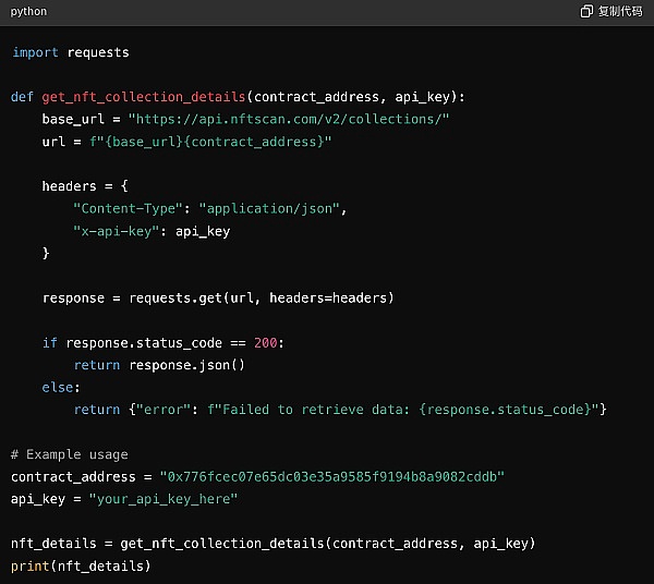 0x776fcec07e65dc03e35a9585f9194b8a9082cddb,HTTP GET 请求访问 NFTScan 的 API 接口,使用 Python 的 requests 库,可以这样构建请求: