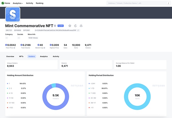 根据 NFTScan 数据显示,截至 5 月 23 日,Mint Blockchain 上已累计发行 NFT 资产 387,477 枚,NFT Contract 37 个,产生交互记录 388,471 条,有过交互的钱包地址 381,141 个,总交易额 0.22 ETH。