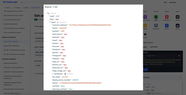 这里我们通过接口 Get an NFT collection “/v2/collections/{contract_address}”检索地址为 0x776fcec07e65dc03e35a9585f9194b8a9082cddb 名称为 GreenID 的详情信息: