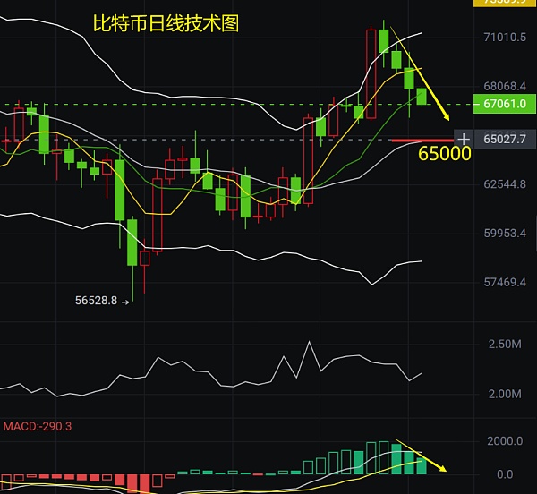 技术面回调是常态,也可看做是大涨之后的修正,目前的关键点就在于65000美元关口,如果是跌破的话,那么我们就不能简单的看做是修正,或许是瀑布,毕竟下方还有空间。纵观这几个月的走势,大饼几次冲击70000美元上方都会来一次大回调。倘若支撑有效的话,那就更好,蓄势二次发力有望迎来新高,所以在这个时候我们就那要耐心的等到,合约上今日依然可保持高沽低渣思路进行。上方关注68500美元一带阻力,下方关注66000美元一带支撑情况。