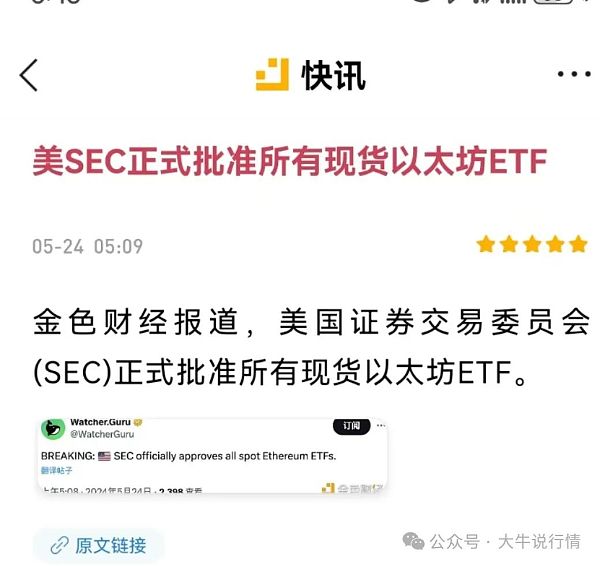 以太坊ETF没通过的时候,看跌的人在说,不可能那么快通过,甚至还有人说今年不会通过,只要不通过就会大跌。今天通过了,这部分人又在说,利好已经落地就是利空,行情还是会跌,关于“利好落地就是利空”这种观点前面的文章有讲到过,今天就不多说了。看跌的人始终只会找各种看跌的理由,找再多的理由都不会影响到踏空的结果,因为行情是不会因为个人的意志而转移。