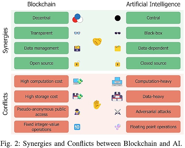 图 2 展示了区块链和 AI 之间的互补与对立之处。