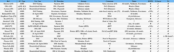 表 1:将区块链用作 AI 的基础设施,其中 DAI = 分布式人工智能、BC = 区块链、DT/FL = 分布式训练/联邦学习、C-Layer = 计算层、TA = 技术分析、DM = 分布式管理、PoS = 权益证明、 DPoS = 委托式权益证明、dBFT = 委托式拜占庭容错、FL = 联邦学习、DID = 去中心化身份、ZK = 零知识、DePIN = 去中心化物理基础设施网络、DC = 分布式计算、DD = 分布式数据、ASBS = 特定应用的区块链系统、IPFS = 星际文件系统、* = 成熟度低/没有公共代码,? = 信息不可用。