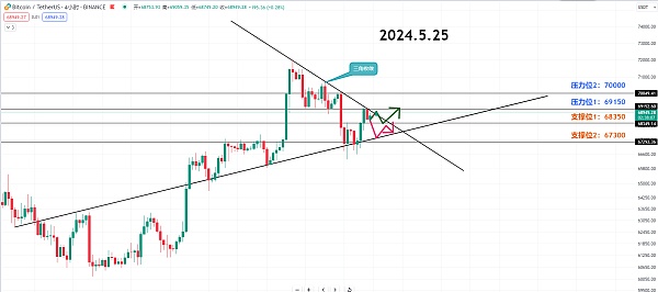 第一阻力参考69150,第二阻力70000。如果价格突破了收敛三角的上方,那么就可以判断短期为多头趋势。