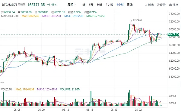 在周末,行情通常不会有太大波动,预计日内行情继续以震荡为主。接下来的趋势向上,预计5月下旬和6月将迎来一个良好的山寨币行情!目前,比特币(BTC)报价在68,700美元附近,以太坊(ETH)报价在3,730美元附近,呈现震荡上扬态势。利好消息将持续发酵,中途的下跌大概率是插针爆单行为,不会影响整体趋势。