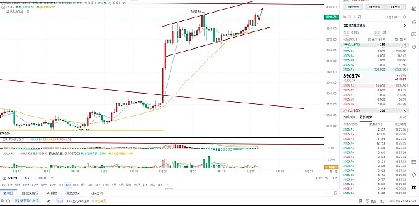 以太坊由于ETF通过的原因一直处于一个多头趋势中,自从24号凌晨插针到最低点位3524也是老王之前预测的点位,也一直说过每一次回踩都是大周期一个定投的时间,老王认为本轮牛市以太坊很难再次回到2字开头了,如果有机会回调到3550那么可以使用多余的闲钱定投大周期,目标看5K以上,认为本轮牛市有机率会去到9K乃至10K,操作建议逢低做多即可,下方关注3888-3850,喜欢做空的币友可以在3950附近分批做空,把握几十个点应该问题不大