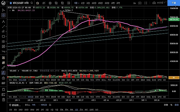 大饼昨日白盘最高触及69570一线受阻回落,随后行情一路下行跌至68188一线,恭喜跟上低多思路的朋友,目前币价在69000附近运行,四小时级别行情回踩ma60均线支撑走出反弹,但力度不强,macd双线走平没有量能,短期走势没什么太大变化,以震荡调整为主,下方还有回踩ma60的可能若破位有机会延续,日线级别受ma7均线压制行情反弹没能突破,目前来看走势偏弱,预计还有回踩的可能,但空间不会不大,整体走势还是偏向多头,思路不变回踩即是机会,上方压制69300-70000,下方支撑68500-67500