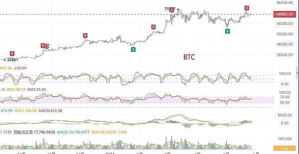 比特币价格在 66000 上方获得支撑并开始再次上涨并且一举突破 68000 的阻力区。空头在 69500 和 70000 附近活跃。高点在 69608 附近形成,目前价格正在修正涨幅,价格跌破了从 66250 的摆动低点到 69608 的高点的 23.6% 斐波那契回撤位,它甚至测试了 68000 的支撑区域。多头目前活跃在从 66250 的摆动低点到 69608 的高点的上行 50% 斐波那契回撤位附近,比特币价格交易价格高于 69500 和 100 小时简单移动平均线,如果出现新的上涨,价格可能会在 69000 附近面临阻力。BTC小时图上还形成一条关键的看跌趋势线,阻力位在 69100 、第一个主要阻力位可能是 69500 。