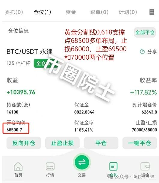 周末连续横盘修复震荡,大盘连续三天回踩站立黄金分割线0.618大支撑点68500位置,周五就是破了68500的空单止损出局后顺势多止盈69000,昨日没有任何安排自己操盘69500空,止盈68500拿下1000点空间,截止发稿前68500多单持有中,目标关注69500和70000整数关口,大家可以关注一下做一个参考