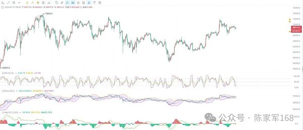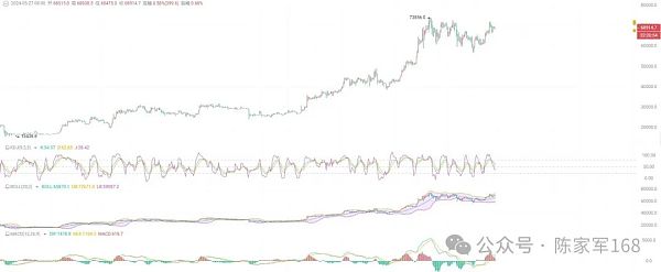 目前比特币现价68900附近,EMA趋势指标上行扩散,EMA15已经到了67500,整体趋势上体还没有结束预计很快就会抬高到68000上方,到时候多头大概率会借机发力破七万,KDJ受阻分割线68500支撑开始向上收缩,MACD放量上行,DIF和DEA高位收缩趋势不明,布林带开口以后空闲一直在上行通道横盘,但是顶底都出现了变化,尤其是顶部压力位已经破了72500,底部支撑也来到了66000,当顶部压力位不再上移以后出现横盘趋势就可以开始从底部支撑入手布局多头了