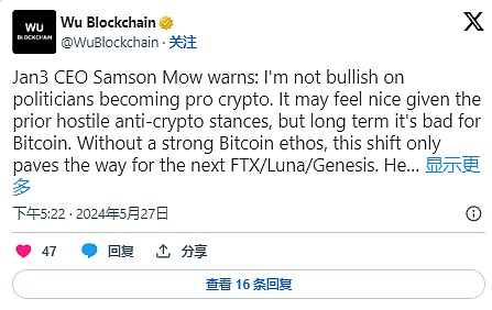 比特币倡导者 Samson Mow 对政治界对加密货币日益增长的兴趣表示欢迎,但他警告不要采取一刀切的监管方式。Mow 担心,如果对比特币和其他数字资产缺乏区分,可能会导致政策误导,从而损害其潜力。