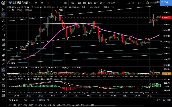 以太坊昨日走势与思路一致再次突破前高,最高触及3976一线受阻回落,低位跌至3840附近,恭喜跟上思路的朋友多单获利近一百点,目前币价在3844附近运行,四小时级别行情冲高回落再次跌回震荡区间,macd多头转空双线粘合走平,短期虽空头占优,但距离支撑较近,若ma30守住行情则会震荡反弹,日线级别价格跌至ma7均线,预计首次跌破的概率不大,若日线实体较大有可能会走出连阴,只要不破3600回踩即是机会,上车机会不多切勿错过,建议分批买入,整体走势仍然很强,上方压制3900-3950,下方支撑3800-3730
