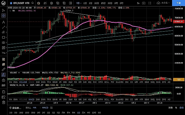 大饼经过周末两天震荡后昨日晚间选择向上进攻,最高触及70700附近受阻又迅速下跌,恭喜跟上低多思路的朋友获利两千点,目前币价在68260附近运行,四小时级别价格未能站稳7w再次回落,macd无量运行双线粘合,行情多空博弈仍在区间震荡,短期来看偏向空头还有下跌空间,下方关注67500-67000支撑情况,日线来看多头没有延续走出阴包阳形态,走势偏空,多单切勿着急入场,目前来看还要调整一段时间,回踩不破65000都可以低吸,突破新高是时间问题,继续持币等待,上方压制68500-69300,下方支撑67000-66600