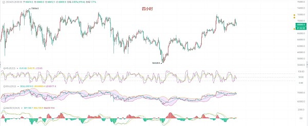 四小时K线出现了空头扳回指标,所以68500附近的支撑守不住会招来进一步的下探,激进者可以回踩上方压力布局空势,EMA15也就是69100附近的支撑变成了目前的强压,可以关注一下,KDJ向下扩散成型,布林带收小口K线昨日破了上轨以后今日连续从上轨直接回踩下轨支撑68200,MACD放量下行,防守点也在68100附近,DIF和DEA向下收口临近多空动能都在这个位置密集,关注一下盘口趋势,出现明确指标以后可以布局,