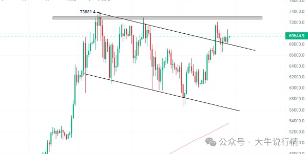 比特币日线级别突破通道极值但出现背离,耐心等待测试前高,我们不盲目看牛回,实事求是,当然如果价格再次回到极值下方,56000就不是底部了。从更广泛的月线级别来看,市场依旧保持着看涨的趋势,并且这种长期趋势短时间内不容易发生根本性转变。细致到周线结构分析,行情在两个阶段性高点处滞留时间较长,双顶形态的可能性增加。