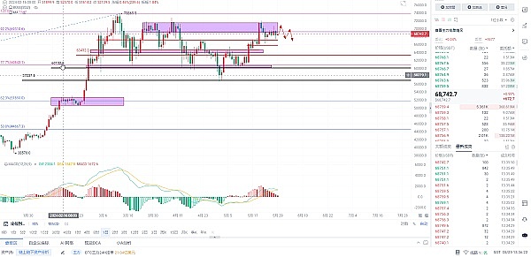 大家好,我是老王,时间来到了星期三,距离六月还剩下两天时间,本月还是一个多空双杀的局面,昨天以太多单,比特币多单如果有跟上的币友,可以耐心持有,也可以进行减仓,比特币日线级以阴线结尾运行在布林带中上轨,日线级别有背离迹象,附图指标MACD多头缩量,虽然日线级别有缩量的迹象,但是我们需要注意的是行情是有机率会去空拉的,昨天清算了一波多头,那么后期清算空头也是正常不过的,从清算热力图来看的话,只要价格突破上一轮牛市高点附近那么空头将被清算一大部分,从昨天晚间到现在价格一直处于69000下方震荡进行上攻,突破需要契机,那么我们回到4小时级别盘面,四小时级别价格运行在布林带中轨只要能在4点收线的时候价格能企稳在中轨上方再配合附图指标MACD移动平均线形成水下金叉,那么突破69000会水到渠来,甚至会再次去到7万上方,综合盘面以及K线走势来看,价格会在区间来回上蹿下跳,下方我们关注67500-67000-上方关注70500-71000,如果先上去,那么就在上方老王所说的位置做空,认为先上的概率比较大。