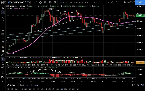 大饼昨日白盘回踩至67500后支撑反弹,最高触及68880附近受阻,价格再次回落,恭喜跟上思路的朋友多单获利一千余点,目前币价在68600附近运行,四小时级别行情回踩至ma90均线后迅速收针,空头止跌反弹,macd空头缩量双线粘合,目前走势偏向反弹,短期压力需要关注ma60均线附近,突破站稳才有机会上行,日线级别行情没什么太大变化依旧在区间震荡,走势比较弱,还需要一段时间盘整,本轮牛市活动轨迹呈缓慢上升走势,每次回踩都是上车机会,建议低吸为主,上方压制69300-70000,下方支撑68000-67500