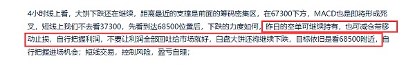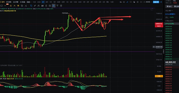 4小时线上看,大饼目前走势属于震荡走势,没有破位,下跌也没有跌破短线低点66312位置,目前属于震荡走势,短线上需要关注上方70687高点突破,下方需要关注66312低点破位,短线交易上白盘是有反弹机会的,昨日下跌走到短线支撑67250附近后收下影线,说明短线支撑有效,短线反弹目标区间预计在69400-70000,还有千点空间,可自行把握进场,推荐点位是68000,跌破昨日低点就可以不用持有了,就要走出更深的下跌了,那就要往66150附近去了,自行把握进场机会;短线交易,控制风险,盈亏自理;