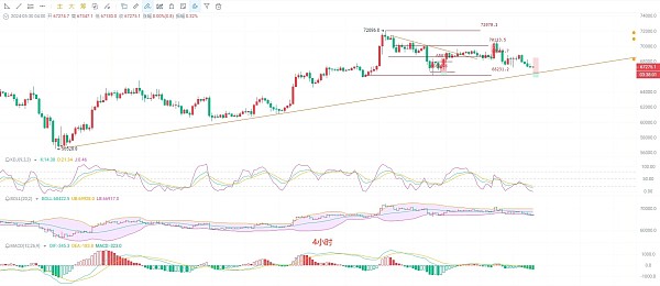 四小时K线连续收阴跌入EMA趋势指标内部,EMA15向下开始交替来到了68000压力位,KDJ受阻67000整数关口支撑,加上布林带下轨支撑也在67000附近,短期内这个位置支撑有效,会有一波小反弹,MACD缩量增筹,思路上可以采取回调不破压力位布局空为主,多为辅