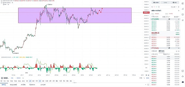 大家好,我是老王,昨天晚间直播间给的以太坊现价空单和多单都是止盈的一个状态,以及昨天前天通过文章和视频也是连续两天看好底部反抽,目前币价一直处于68000附近来回震仓盘整,比特币已经在 10,000 美元的价格区间内交易了十多周,但新的历史高点仍然难以实现。尽管比特币价格多次试图突破 72,000 或跌破 60,000 美元,但其价格仍然维持区间波动,在交易量下降的情况下达到盘中低点约 67200,这表明盘整期将延长,如果67000这个关口实体失守,那么趋势将会回到箱体区间中下方进行盘整,如果价格能在这个关口止跌进行一个反抽重新去到7万上方那么我们需要注意的是日线级别的顶背离,所以之前老王也有在视频中说过,高位需要减仓了,这两天的走势清理了大部分多头,如果能按照预测的走势去进行反弹一波没有企稳的话,那么认为后期会有一个中长线的回撤,今日操作思路依旧是不实体破67000那么继续埋伏多头,67500-67000区间分批做多,目标依旧是70000-71000,以防获利回吐,大家可以中途减仓,如果昨天前天按照思路交易的粉丝,应该拿到千把个点。