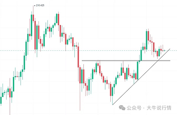 SOL开始走弱,目前形成了一个震荡区,5月初的时候,我也聊过SOL,一个月快要结束了,从盘面的走势来看并不乐观。这波多头缩量上涨,价格来到上方压力位附近,上方有两个压力位,一个是210美金,一个是上波牛市的前高260美金。这两个压力位的压力很大,按照这样的量能来看,很难突破上方的压力位。这个位置更像是主力在出货,虽然不一定会出完,但是哪怕是出掉部分,SOL后期都将会进入一个长时间的震荡回调。SOL这波上涨,是因为铭文的热度炒作,热度冷却,价格自然就会回落。