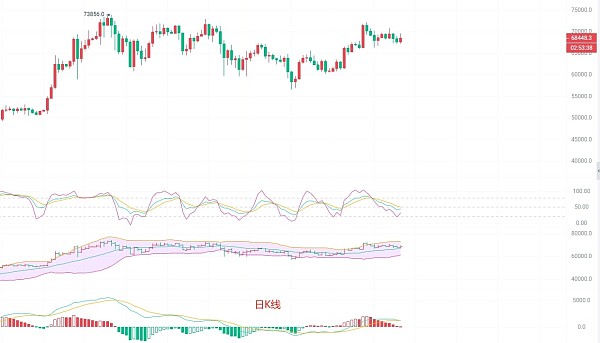 来看今日盘口,截止发稿前早上五点多比特币现价68400附近,可以说白天横了一天的行情,晚上天黑以后都走完了,这行情导致现在我们做交易的熬夜成常态了,日K线跌破EMA15趋势指标67700以后拉伸破了69500,目前站立EMA15附近,整体盘口趋势依旧要继续下看,关注EMA30的支撑66500,KDJ短期受阻,布林带出现收缩现象,K线站立67000以后拉伸,多空都在收缩,MACD放量即将结束,收官之前K线能都开始缩量让DIF和DEA进入死叉阶段很关键,可以关注一下,