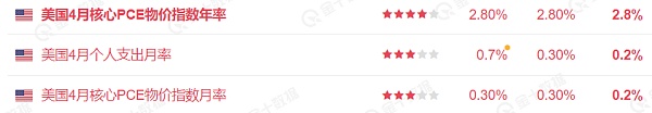 美国商务部最新发布的报告显示,4月份PCE通胀率环比上涨0.3%,与市场预期相符。同时,该月PCE同比涨幅达到2.7%,亦符合预期。在核心个人消费支出方面(不包括食品和能源价格变动),通胀率上月环比上涨0.2%,前月则为0.3%。按年率计算,核心PCE通胀率上涨2.8%,与3月份涨幅相近。