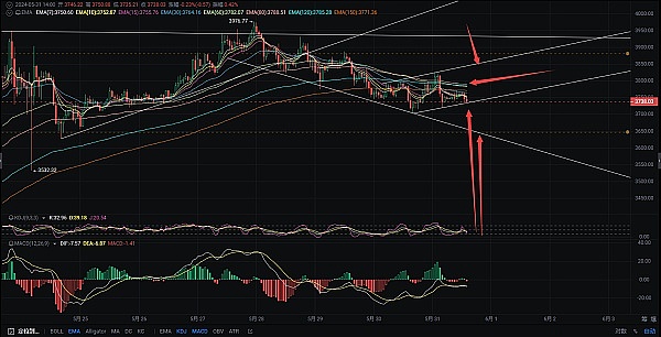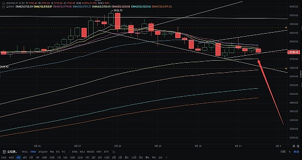 以太坊1小时来看走出了新的趋势通道,下方3700关口确实支撑很强,上方短期压力看EMA80位置,从KDJ形态来看下方并没有多少空间,走完差不多EMA10,15就要开始拐头向上了,加上主力也还在继续调控,短时间币价可能会再一次冲击3800上方;