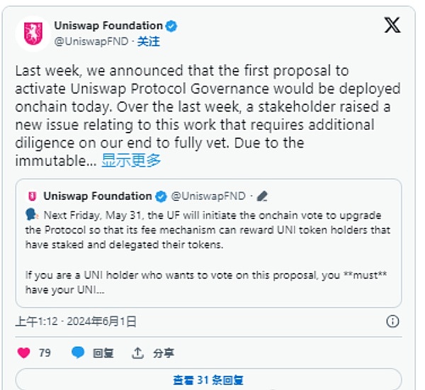 Uniswap 基金会在X 上发文为此投票推迟表示歉意,并解释说:
