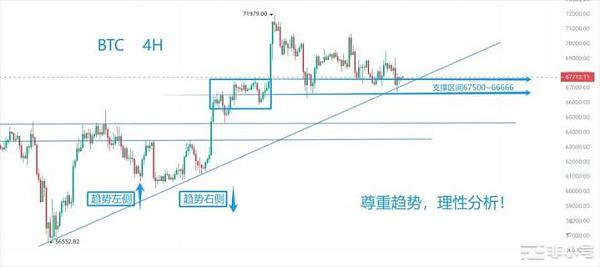 BTC在给的<趋势线>位置获得了支撑,盘面最低66670也是完美回踩支撑区间下轨。接下来的走势无非是直接涨的问题,还是浅跌一下再突破前高的问题,BTC短线机会不明显,这一块可以用山寨做替补,多头趋势下,中长线的筹码可以买入或持仓,近几天变盘向上是大概率的。有回踩的话,逢低干进去就完了,持币待涨!