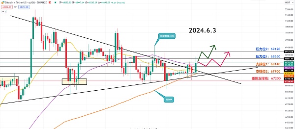 做空入场位参考:68800-69200区间分批做空 防守500点 目标68100-67700