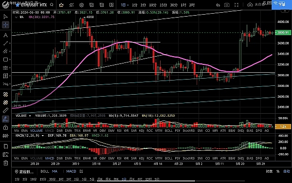 以太坊昨日早间最高触及3837一线受阻,白盘整体呈震荡下行走势,低位跌至3752一线支撑反弹,恭喜跟上思路的朋友多单获利近一百点,目前币价在3815附近运行,四小时级别如盘面所示行情呈横盘走势,上下波动较小,ma均线缠绕,短期一根阳线吞没前期跌幅,走势来看偏向多头,但能否突破区间还需要关注反弹力度,日线级别反弹试探,持续性不强,若能站稳3830上方则有上行的机会,反之会继续震荡,方向仍是多头,长线思路没变,逢低做多为主,上方压制3830-3880,下方支撑3780-3750