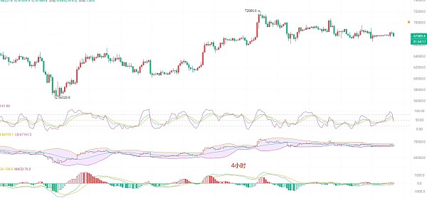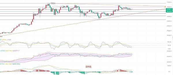 来看盘口,截止发稿前凌晨两点多,比特币现价67600附近,日K线最高68500附近,目前在冲击前低,也是关键支撑点黄金分割线0.618支撑70000整数关口,下方分割线0.5的支撑在65000附近,按照以往主题思路来判断,这个位置属于重点支撑位,回踩这个位置再拉伸市场就足够消化了,也就是EMA60趋势指标支撑点的位置 ,KDJ向下扩散继续加上布林带收口,多空收缩,上下空间开始集中汇聚在68000关口附近,这个时候行情波动都在千点以上,MACD缩量下行以后没有增筹,DIF和DEA高位向下扩散继续,趋势上空还没有走完,一颗红心两手准备最好