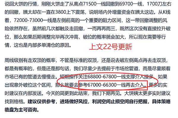 大家好,我是交易员格格。文接上回,先说说上文大饼给出的接多位置,给了两个区间去接,第一个68800-67800走到后出现小幅反弹,力度有限,第二个就很不错,67000-66300,上文也强调过,破位第一个就去第二个区间去接,行情在66200一线反弹70700一线,这波的收获是很不错的,对于短线来说,有3000-4000刀的空间。