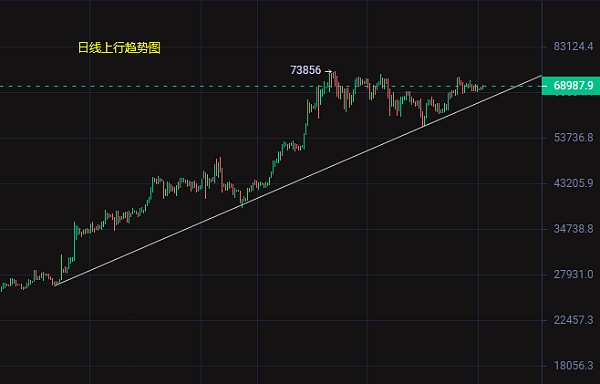 1、日线大周期自去年10月份构筑的上行趋势以来一直得以保持(如下图),期间以27000作为起涨点,通过回踩38550、56550支撑点阶段式上涨,这一轮趋势没有遭到的任何的破坏,也是我们持续看涨的关键依据!