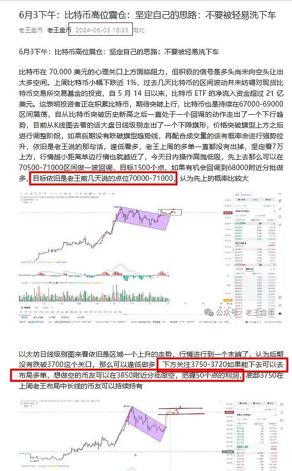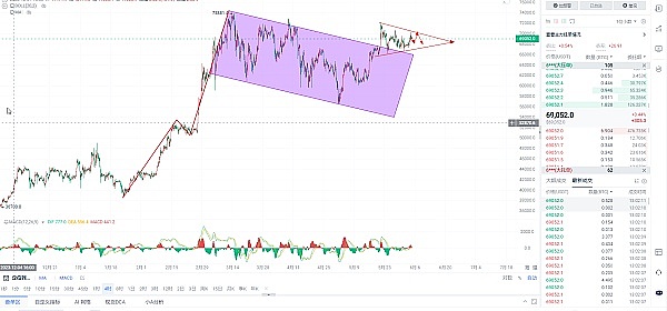 作日比特币日内涨幅上涨4.4% 至最高70300附近开始回调,并没有有效的突破站稳前轮历史新高,形成了一个多空双杀的局面,冲高回落之后一直区域69000附近进行震荡调整,日线K线价格运行在布林带中轨上方,从短线来看只要日内价格没有实体跌破下方中轨68200这个支撑位,那么依旧会进行反弹,四小时级别附图指标MACD多头虽然有缩量迹象,但是并不妨碍后期冲高的动力,从盘面的走势去看自从下降旗形K线型态走出来之后,已经冲破价格调整大约半个月了,也是三角区间一个末端行情了,大的方向也即将来临了,今天日内交易没有什么大消息面,那么认为还是一个多空双杀的局面,高抛低吸既可以,有机会回调68000附近可以分批多单,看7万上方,空单可以在70500附近分批做空,目标1500个点。