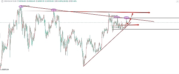 币谨言:6.4比特币插针上方压制后再次回到三角区域内