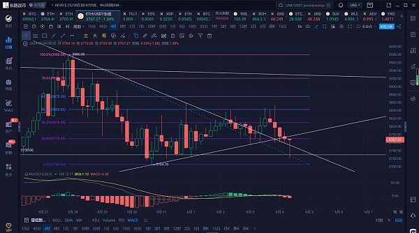 以太坊上个交易日白盘震荡上行,晚盘插针3850附近高点承压回落,刚刚最低跌至3720附近低点反弹,现行情位于3760附近震荡。
