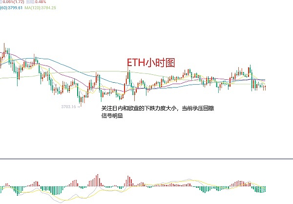 6月4日以太坊(ETH)合约技术面分析:今日方面,大周期日线级别昨日报收小阴线,K线形态单阴单阳,价格还是在高位,但上涨和下跌都没有力度和延续性,唯一比较明显的就是附图指标快慢线当前粘合死叉向下,还需要时间和力度延续成为趋势才会更加的明显;交易还是保持短线为主;短周期小时图昨日欧盘上涨美盘承压回撤,凌晨横盘整理后今日早间二次承压下跌,当前K线形态连阴,价格在均线下方,附图子表死叉运行,那么这样来说日内大概率还是要跌的,因此今日ETH短线合约交易策略:现价3776区域直接控,止损3801区域,目标看3730-3715区域