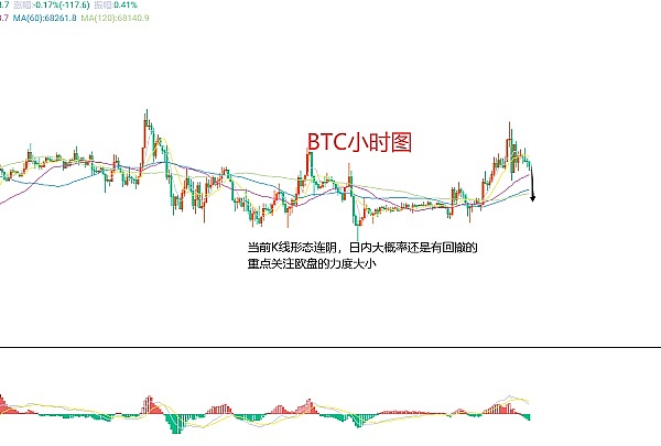 6月4日比特币(BTC)合约技术面分析:今日方面,大周期日线级别昨日报收小阳线,K线形态连阳但力度不大,价格在高位短时间没有突破信号,附图指标死叉运行没有延续,所以大周期的趋势给出的信号是会维持震荡,那么我们就要注意方向的把握和控制,交易方面还是尽量短线为主;短周期小时图前一日欧盘价格上涨,美盘延续,凌晨高位震荡后今日早间承压回撤,当前K线形态连阴,价格在均线下方,附图指标死叉运行,那么日内还是大概率要跌的,关注欧盘的力度大小,因此今日BTC短线合约交易策略:现价69000区域直接空,止损69400区域,目标看68400-68200区域;
