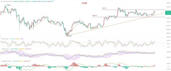 来看今日盘口,截止发稿前凌晨三点,比特币现价69200附近,一来一回又回到了最初的建仓点附近,日K线连续多日站立EMA15支撑点67900附近,忽然拉伸确实处于意料之外的情况,按照目前盘口趋势上看,多头还没有走完,但是,今日空势下来的实在是太快,所以没有冒险在68000附近接多,错过了最佳的入场点,只能继续空档等机会,KDJ金叉成型,MACD也开始缩量增筹上行,DIF和DEA高位收口,布林带还在收缩,顶部上轨压力位已经来到了70900,下轨支撑也来到了65500,行情大概率会再次冲击七万整数关口的压力,可以关注一下,在高位布局
