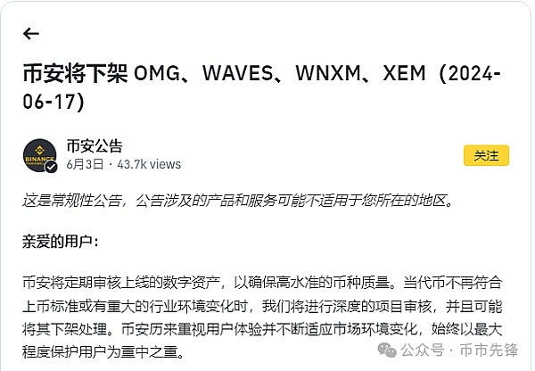 后,价格暴跌 不再 宣布 币安 支持该代币